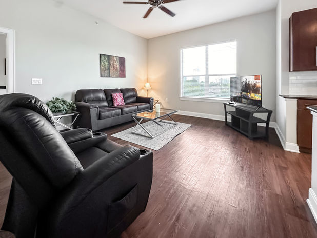 Welcome to our three bedroom, two bathroom apartment at Sync Med Center! All of our three bedroom apartments at Sync Med Center feature two queen size beds in two of the bedrooms and a king bed in the third bedroom. If the apartment is not on the ground floor, you can still access the apartment without taking stairs via the multilevel parking garage or elevator.